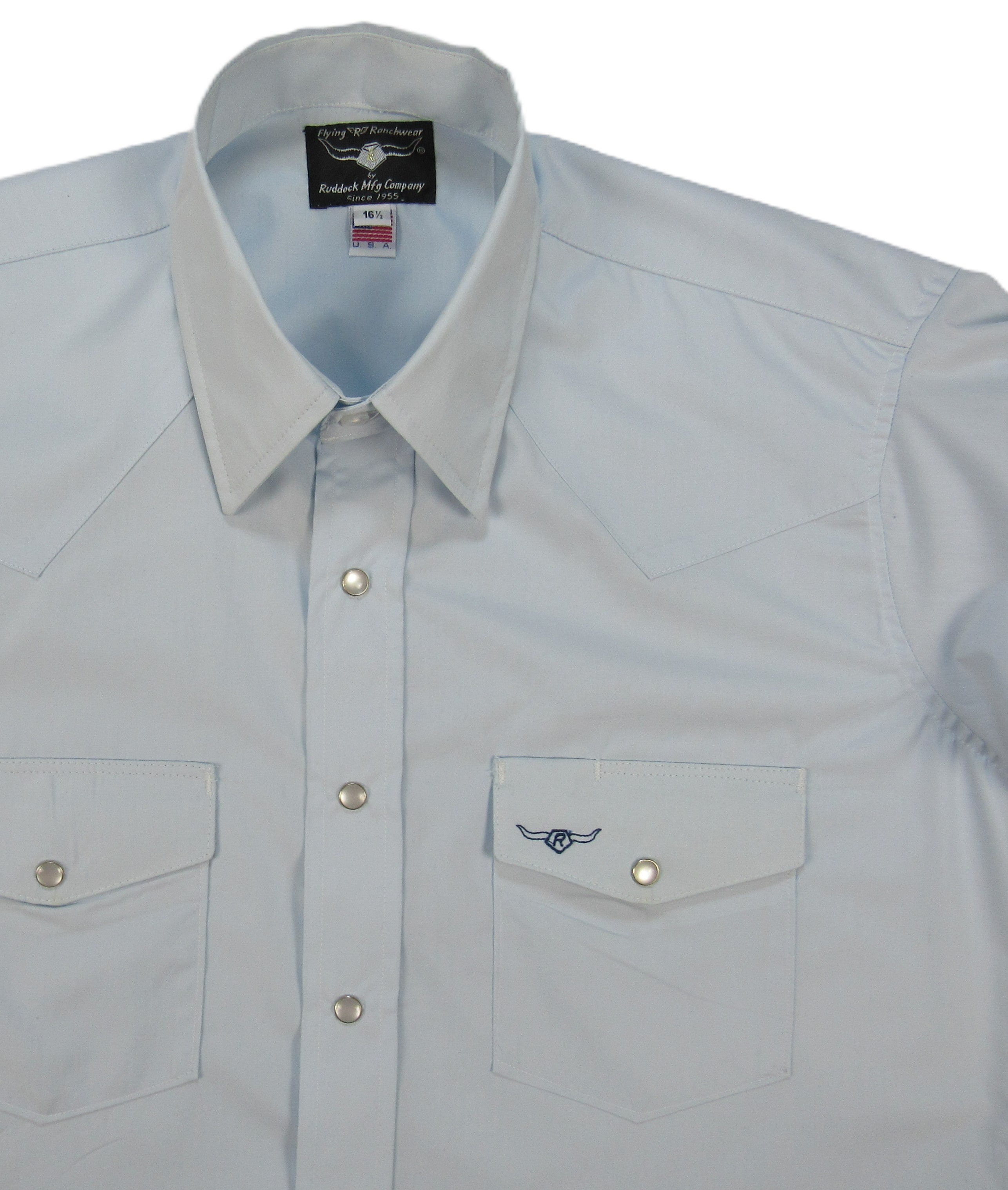 Brisa Solids by Flying R Ranchwear are everything a short sleeve shirt should be. They feature light and airy fabric weighing in at a breezy 3.3 oz. per square yard in cotton rich poplin and all of the American Made western features you would expect; fantastic Flying R Ranchwear fit, western yokes, snaps, and flapped pockets with embroidery. Available 15.5-18.5 and limited tall sizes. Made in USA. 60%Cotton/40% Polyester - Pale Blue