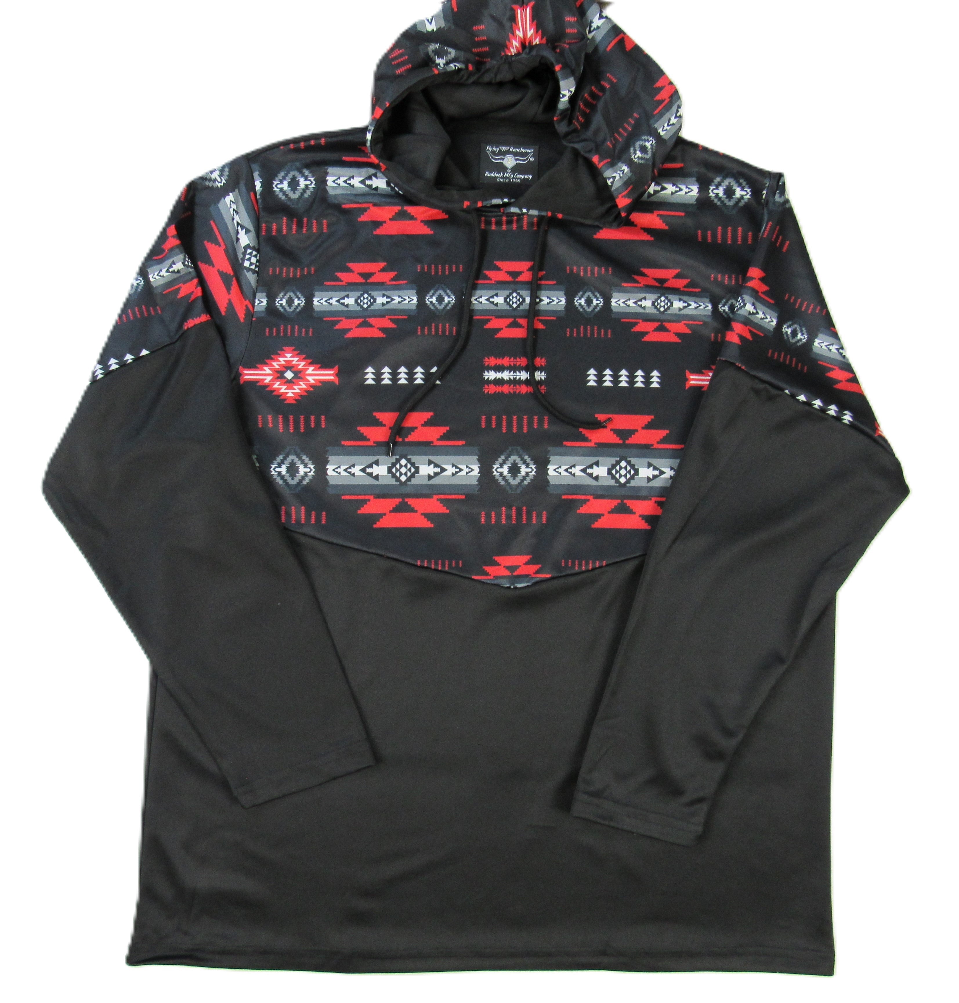 Our new thermal hoodie is long enough to keep the cold air from sneaking up your back. Perfect for tailgating or hiking. It's long enough to keep cold air from sneaking in and light enough to wear all day. Made with performance poly that breathes while keeping you warm. Long sleeves and a drawstring hood complete the styling. True to size, if you wear a large, order a large. Printed in a current southwest motifs in black/gray on a black solid. Flying R Ranchwear Machine washable, 100% polyester. Imported