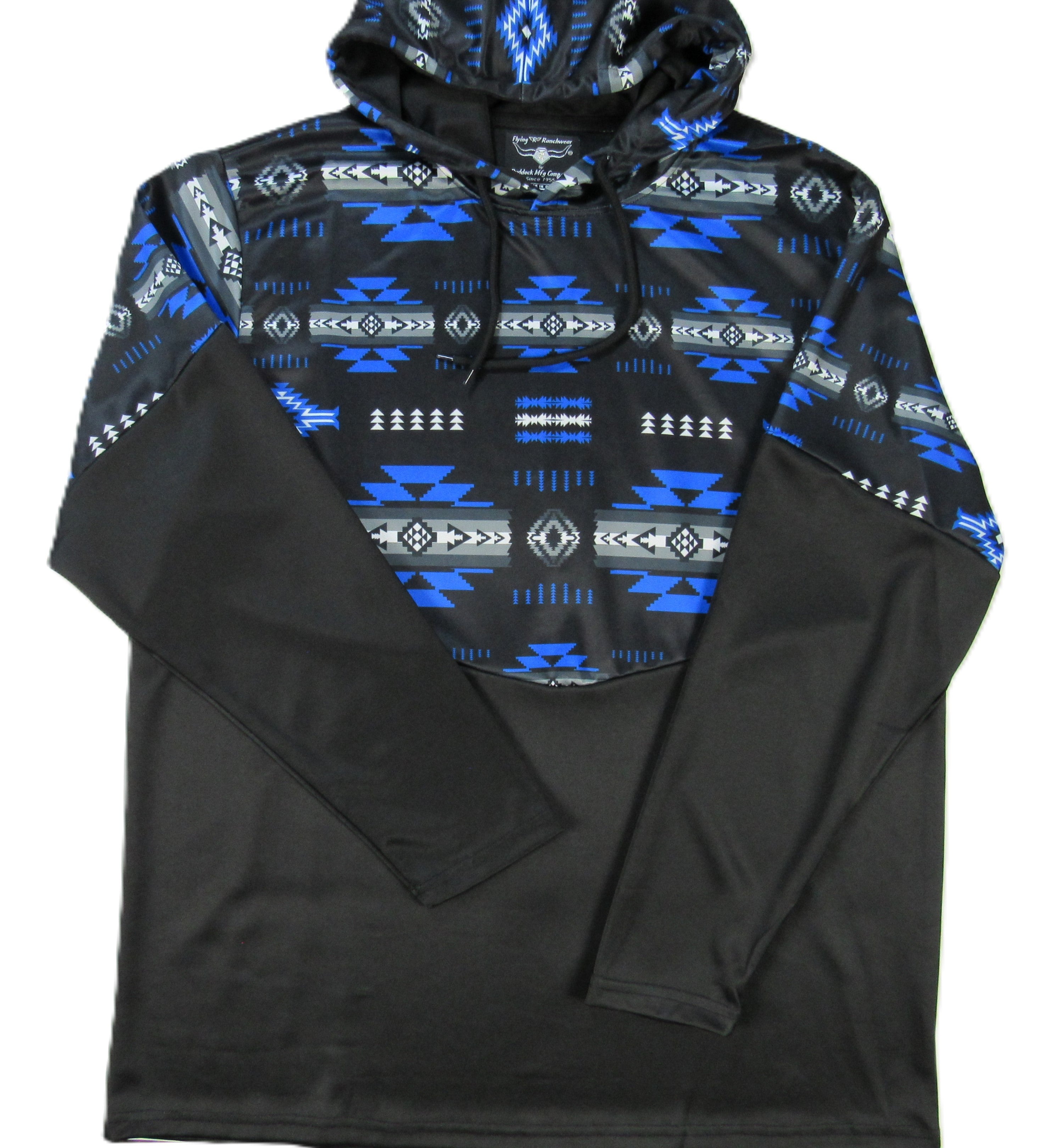 Our new thermal hoodie is long enough to keep the cold air from sneaking up your back. Perfect for tailgating or hiking. It's long enough to keep cold air from sneaking in and light enough to wear all day. Made with performance poly that breathes while keeping you warm. Long sleeves and a drawstring hood complete the styling. True to size, if you wear a large, order a large. Printed in a current southwest motifs in royal/white on a black solid. Flying R Ranchwear Machine washable, 100% polyester. Imported