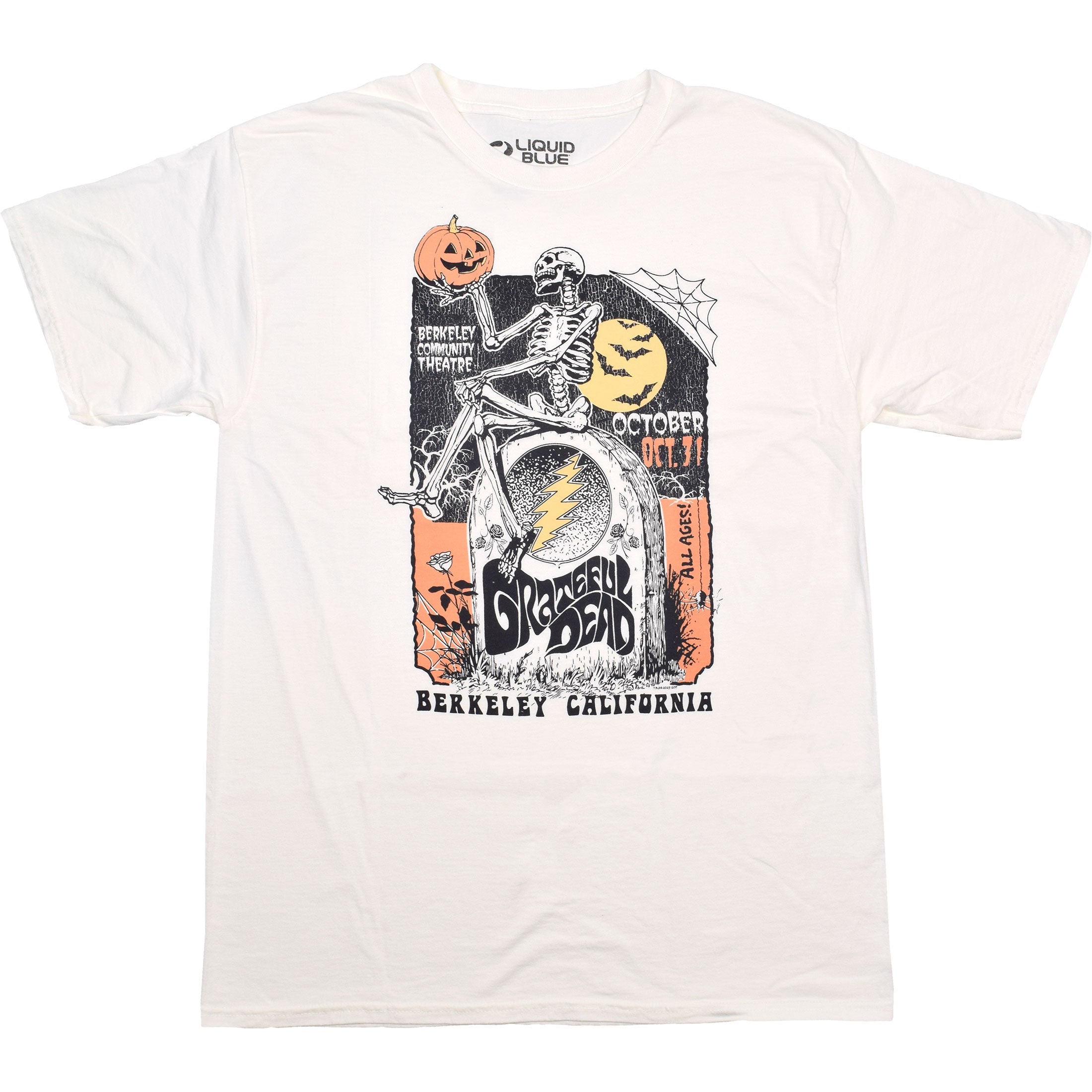 Step into the spirit of a legendary night with this officially licensed Grateful Dead Halloween T-Shirt, commemorating the unforgettable October 31st, 1984 show in Berkeley, California. A must-have for Deadheads, this design captures the eerie magic of Halloween Dead-style. Front and center, a grinning skeleton - true to the band's iconic imagery - sits perched on a weathered gravestone etched with “Grateful Dead”. In its bony hand, it cradles a glowing jack-o’-lantern and overhead, a luminous full moon lights up the dark sky, as bats sweep across in flight, completing a hauntingly beautiful scene that channels the mystique of both the holiday and the band’s legendary performance.